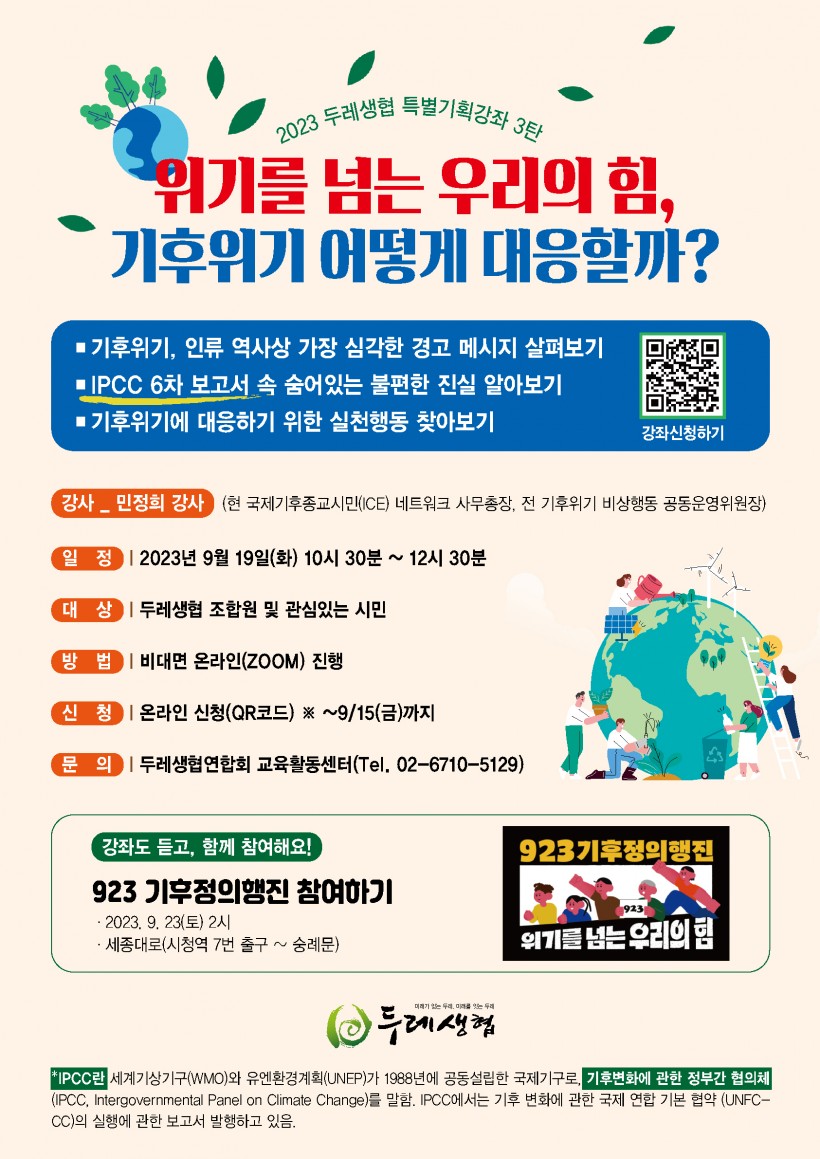 [공지] 2023 두레생협 특별기획강좌 3탄 <기후위기 어떻게 대응할까?>> 페이지 정보 작성자 두레지기 작성일23-08-31 13:58 조회8,726회 댓글0건 목록 본문 사전 신청하기▶(9/15 까지) 사전 신청하기▶(9/15 까지) 목록