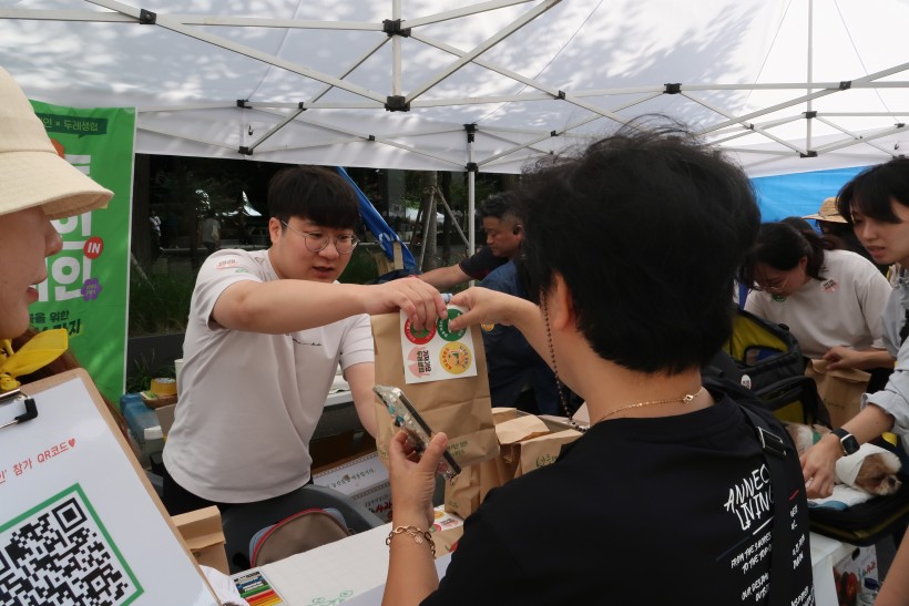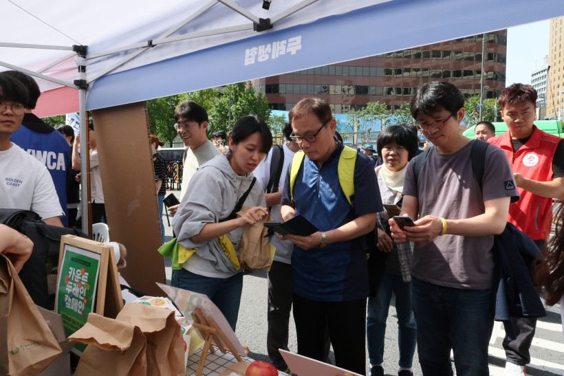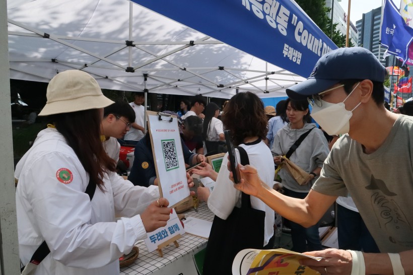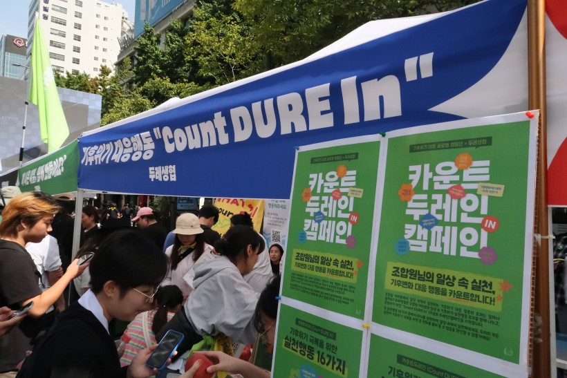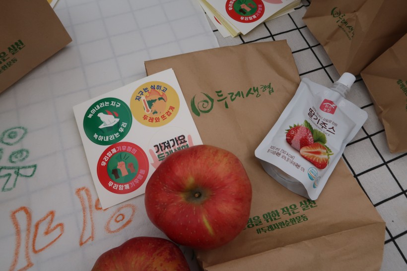 본격적인 행진에 앞서 열린 사전부스에는 오전부터 많은 시민들이 몰려들어, 기후위기에 대한 뜨거운 관심을 확인할 수 있었습니다. 두레생협에서는 일상 속 기후위기 대응 행동 실천을 약속하는 카운트 두레인 캠페인에 참여하는 시민들을 대상으로 사과 300개, 주스 100개를 나눠주며 기후위기에 대한 관심과 실천을 독려했습니다.