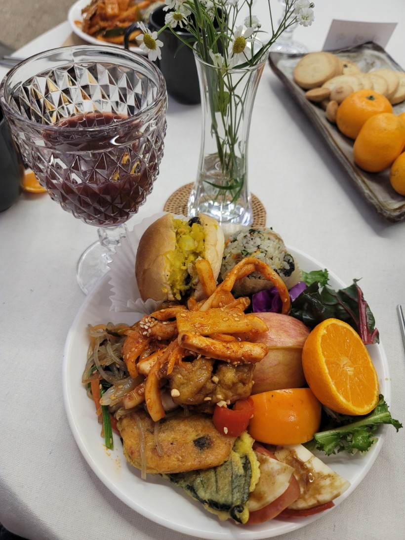 기분좋은 시작을 위해 꽃과 테이블보, 다과와 따뜻한 무알콜 뱅쇼를 준비하였습니다. 30인분의 뱅쇼는 처음이라 걱정이 많았지만 따뜻하고 맛있다며 3~4잔씩 드시는 분들도 계셔서 참으로 뿌듯하였습니다.