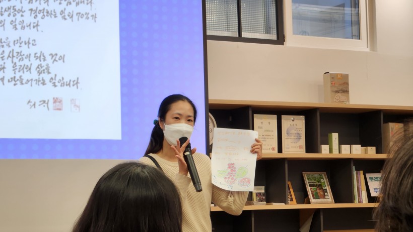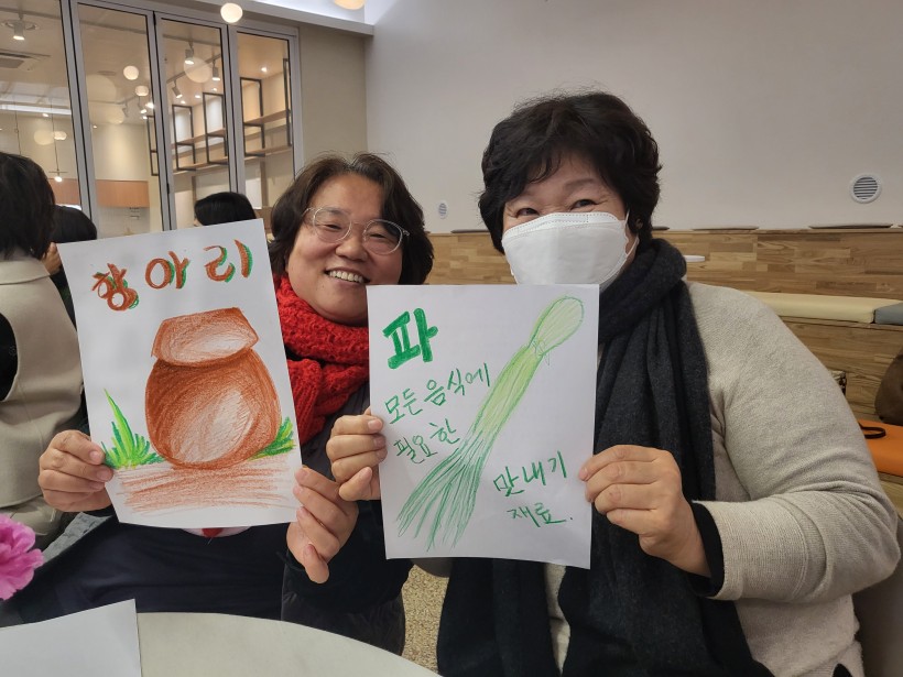 오전 시간엔 식생활 강사 답게 식재료와 조리도구로 자기를 표현하는 시간이 있었습니다. 마스코바도, 파, 밥, 당근, 주걱, 항아리 등 정말 다양한 그림을 그려주시고 재미있게 자신을 표현해주셔서 웃음이 끊이질 않았던 시간이었습니다.
