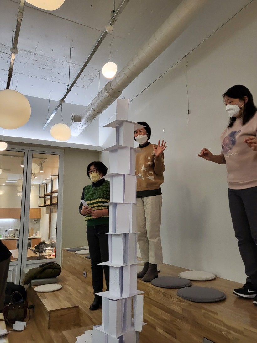 우리는 개인이 아닌 강사 "네트워크"이기에 서로 협동해보는 게임도 진행하였습니다. 종이만으로 가장 높이 탑을 쌓는 게임에서 사람 키보다 훨씬 높은 탑을 같이 쌓으시는 모습을 보며 오늘 처음본 분들이 맞나 싶을 정도로 협동을 잘 하셨습니다.