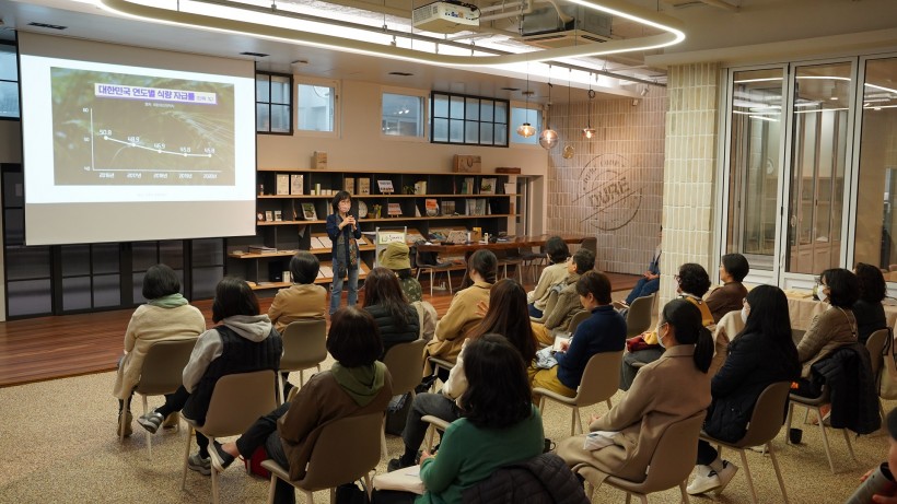 강의는 지난 3월 14일, 두레생협연합회 지하 메인홀에서 진행 되었습니다. 작가님께서는 여러 사진을 보여주며 강의를 시작하셨는데요, 그중에서도 인상 깊었던 사진은 마트의 냉장식품 진열 매대 사진이었습니다. 문이 없는 냉장고와 같은 냉장식품 진열 매대로 인해 낭비하는 전기와 같이 아직도 우리가 무의식적으로 지나치는 낭비가 많음을 알 수 있었습니다. 또한 도시에서는 상수도시설이나 냉난방이 잘 갖춰져 있다 보니, 기후위기로 인한 불편함을 잘 느끼지 못해, 덩달아 기후위기의 심각성을 제대로 인식하지 못하고 있다고도 지적하셨습니다.