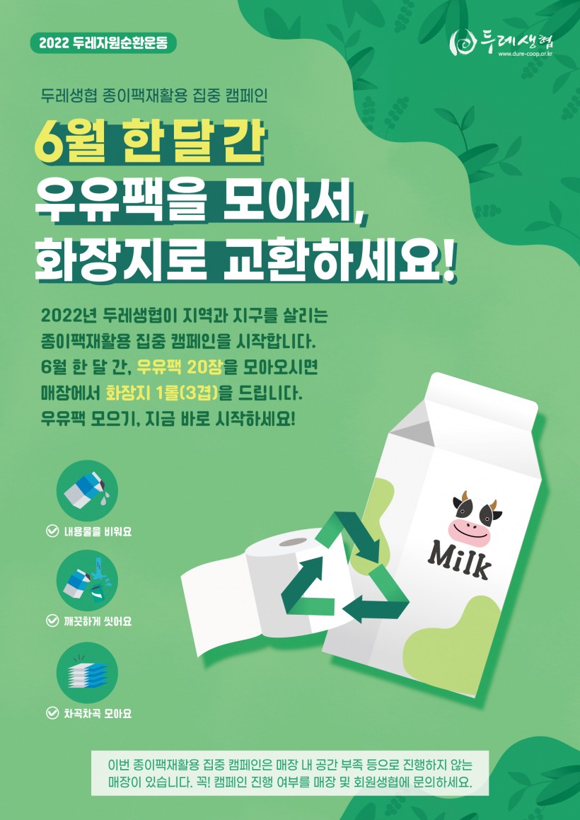 [종이팩재활용 집중 캠페인] 6월 한 달 간 우유팩을 모아서 화장지로 교환하세요! 페이지 정보 작성자 두레지기 작성일22-05-31 11:13 조회12,308회 댓글0건 목록 본문 목록
