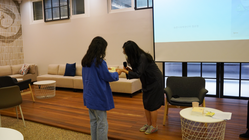 2부에서 진행된 질의응답 시간은 조금 특별했는데요, 작가님은 자신이 태어난 계절의 제철음식과 함께 이름을 소개하고 질문해달라고 하셨습니다. 덕분에 각자 딸기의 계절, 김장의 계절 등으로 자신을 소개하고 질문을 하며 화기애애한 분위기에서 질의응답이 이뤄질 수 있었습니다. 또한, 행운권 추첨을 통해 작가님의 친필 사인을 담은 책을 선물하는 깜짝 이벤트도 함께 열렸습니다.
