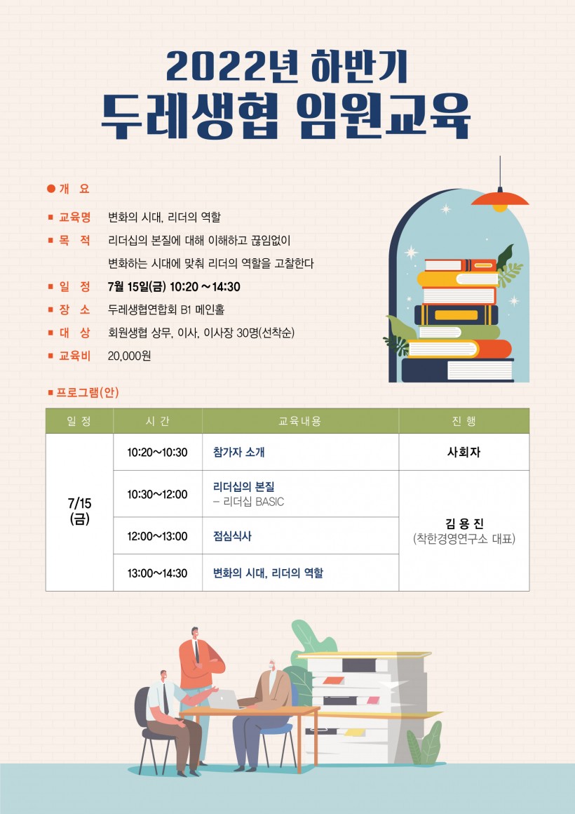 [안내] 2022년 하반기 두레생협 임원교육 <변화의 시대, 리더의 역할> 페이지 정보 작성자 두레지기 작성일22-06-17 09:14 조회11,538회 댓글0건 목록 본문 교육비: 20,000원 (기업은행 065-112134-04-036 두레생협연합회) 신청: https://url.kr/9fwp8e 목록