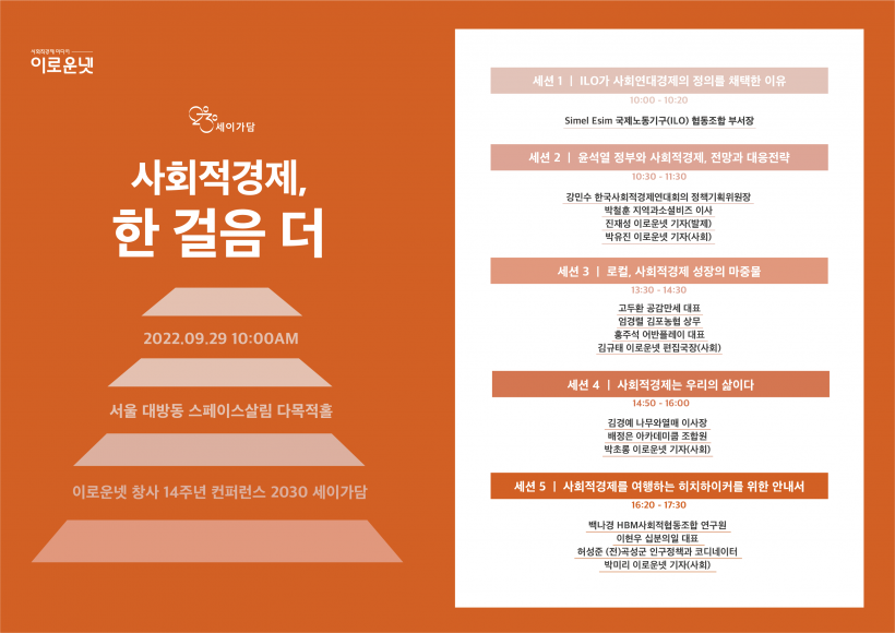 올해 컨퍼런스 주제는 '사회적경제, 한 걸음 더'입니다. 올 한 해 사회적경제에 있었던 변화를 돌아보고 한 걸음 더 나가기 위한 방안을 5개의 세션으로 이야기합니다. 이번 컨퍼런스는 오직 당일 현장에서만 볼 수 있습니다. 컨퍼런스는 오프라인으로 진행되며 현장중계와 녹화중계 모두 제공하지 않습니다.