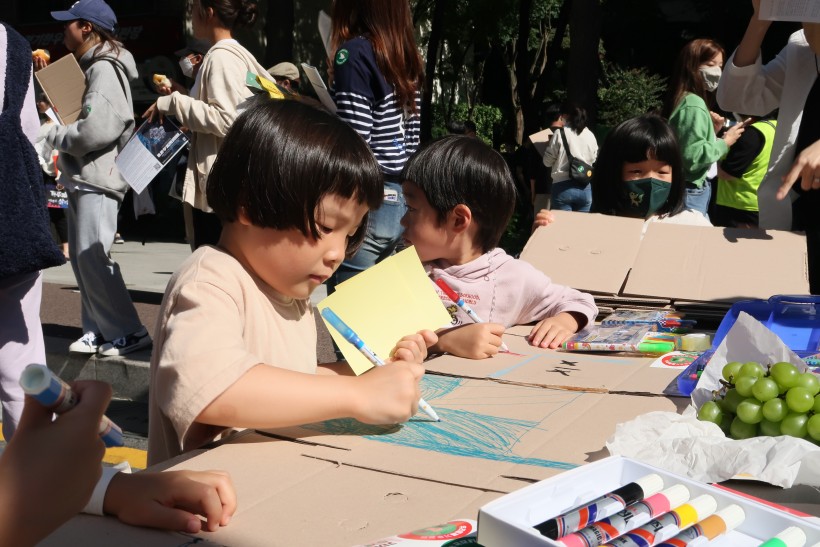 두레생협은 본 집회 전 사전부스를 운영하여, 두레생협 스티커와 안내책자를 배포하고 ‘손피켓 만들기’ 코너를 운영했습니다. 손피켓 만들기는 박스를 재활용해 자신만의 개성 있는 피켓을 만들 수 있어 인기가 많았습니다. 엄마, 아빠와 함께 온 아이들도 고사리 손으로 열심히 피켓을 만들었습니다.