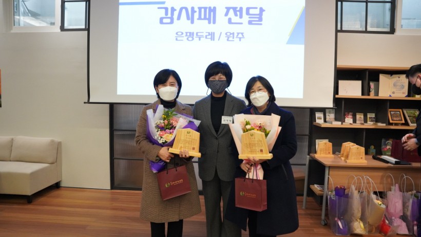 이어서 지난 해 두레생협연합에 기여한 회원생협과 생산지에 감사패를 전달하는 시간을 가졌습니다. 회원생협에서는 은평두레생협과 원주두레생협이 수상하였습니다. 생산지에서는 강화드림, 자연에찬, 삼양수산이 수상하였고, 자연에찬, 삼양수산 생산지는 일정이 맞지 않아 참여하지 못하여 강화드림 생산지에 감사패를 전달하였습니다.