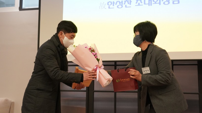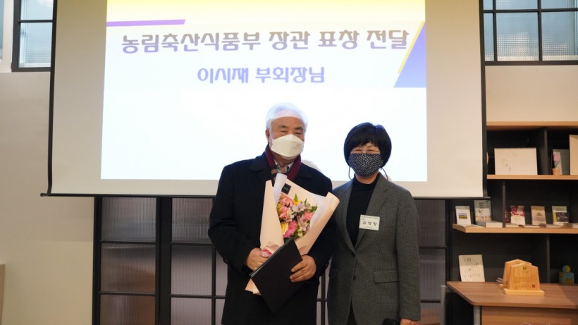 다음으로 고 한성찬 초대회장님께 특별 공로패를 전달(대리수상: 한대건 율곡식품 대표)드리고 기리는 시간을 가졌습니다. 그리고 이시재 부회장님께 농림수산식품부 장관표창을 전달하고 축하하는 표창 전달식을 진행했습니다.