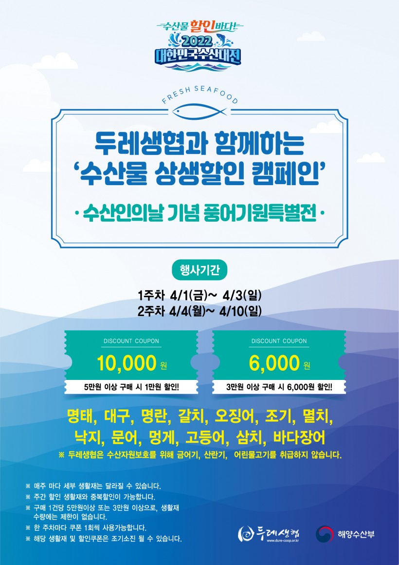 [안내] 두레생협과 함께하는 '수산물 상생할인 캠페인' - 수산인의날 기념 풍어기원특별전 페이지 정보 작성자 두레지기 작성일22-04-04 16:35 조회12,437회 댓글0건 목록 본문 목록