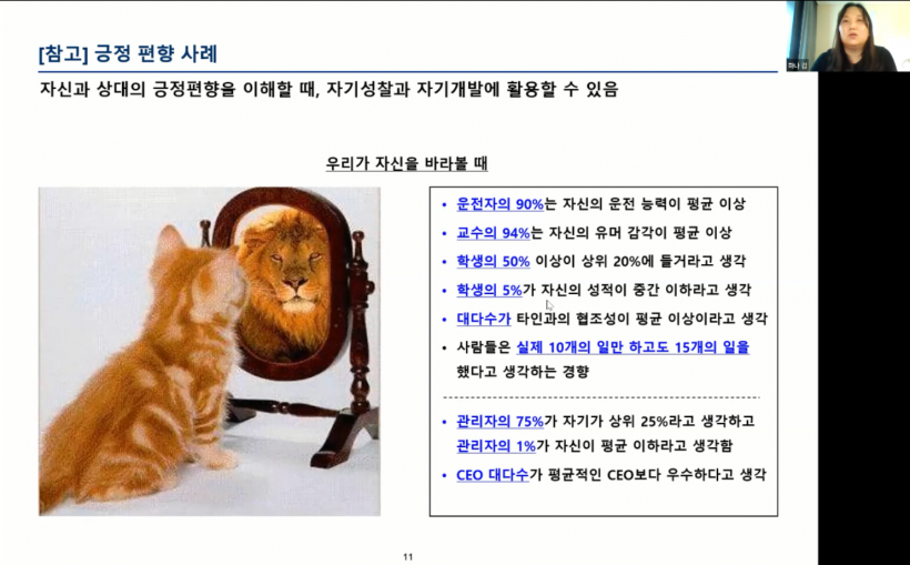 4월 12일 첫 날, 첫 강의인 리더의 자기이해는 아주대 심리학과 교수님이신 김하나 강사님께서 열어주셨습니다. 전문적인 성격검사를 토대로 자신과 타인을 새롭게 바라보는 계기를 만들어주는 강의였습니다.