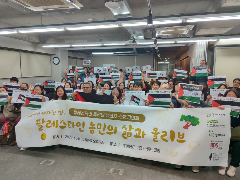 이 자리에서 푸아드는 이스라엘의 점령과 군사폭력, 그리고 팔레스타인 농민들의 저항을 이야기하며 "농사를 짓는다는 것은 땅을 포기하지 않겠다는 선언"이라고 말했습니다. 그리고 다 같이 팔레스타인 국기에 연대의 메시지를 적고 연대의 목소리로 단체사진을 찍었습니다. 현장에 함께한 시민들은 푸아드의 말 한마디, 한마디에 집중하며, 우리가 얼마나 팔레스타인의 현실에 무지했는지 돌아보게 되었다고 전했습니다.
