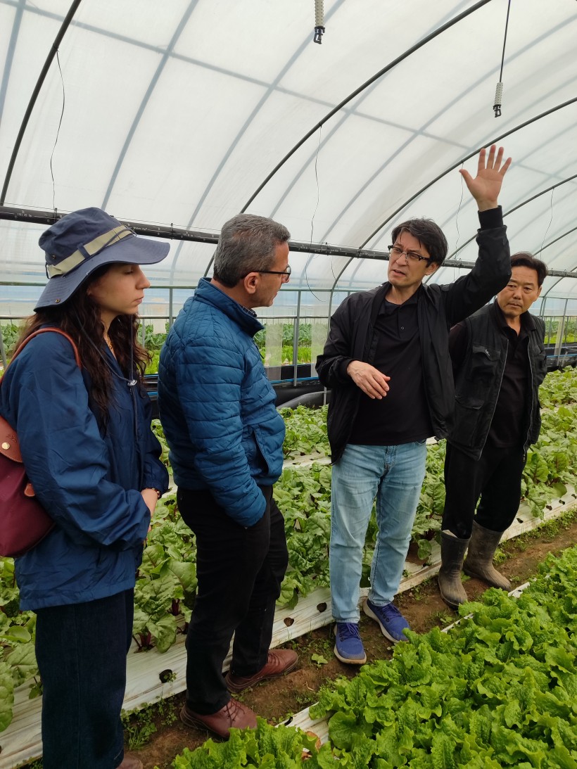 마지막으로 찾은 곳은 두레한강생산자회였습니다. 여기서는 비닐하우스와 생산지를 직접 둘러보며, 한국 농민들의 현실과 두레생협 생산자들이 어떤 방식으로 생태적 농업을 실천하고 있는지에 대해 서로 경험을 나눴습니다.