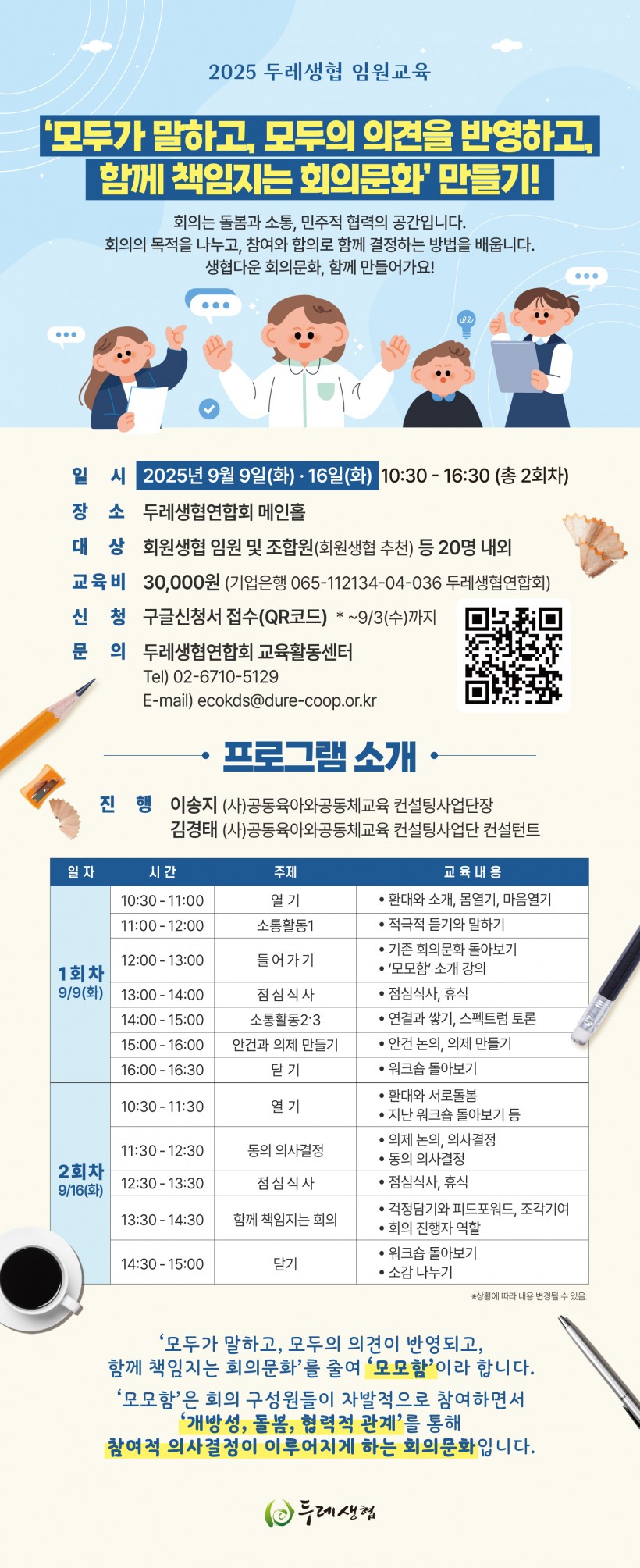 [모집] 2025 두레생협 임원교육 페이지 정보 작성자 두레지기 작성일25-08-08 08:33 조회962회 댓글0건 목록 본문 <2025 두레생협 임원교육> 안내 ‘모두가 말하고, 모두의 의견을 반영하고, 함께 책임지는 회의문화’를 주제로,☼ 회의의 목적과 의미를 성찰하고,☺ 참여와 합의로 함께 결정하는 방법을 익히며,⚙ 생협다운 회의문화를 함께 만들어가기 위해<2025년 두레생협 임원교육>을 진행합니다. 회원생협 임원 및 조합원분들의 많은 관심과 참여 바랍니다. □ 교육문의 : 두레생협연합회 교육활동센터 Tel.02-6710-5129 E-mail: ecokds@dure-coop.or.kr ▶신청하기 ▶신청하기 목록