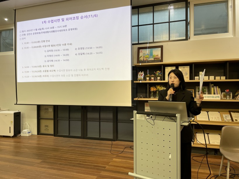 3회에 걸친 수업 시연과 피어코칭은 강의 역량을 점검하고 발전시킬 수 있는 핵심 경험이었습니다. 특히, 김민선 강사님의 균형 잡히고 세심한 진행 덕분에 과정은 탄탄하고 집중도 높게 운영되었습니다. 동료 강사들의 교안과 시연을 통해 다양한 아이디어와 전달 방식을 배우고, 스스로 강의와 교안 구성에 대해 성찰할 수 있었습니다. 15분이라는 짧지만 집중적인 시연 시간 동안 이론, 활동, 시연을 조합하며 교육의 질을 높이는 경험을 직접 체험했습니다. 피어코칭을 통해 다양한 경력과 관점의 동료로부터 구체적인 피드백을 받으며 수업 진행과 전달 방식까지 입체적으로 점검할 수 있었습니다.