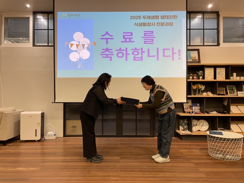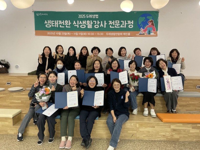 이번 과정을 통해 인간과 자연이 공존하는 생태적 전환을 실천하는 ‘두레생협 생태전환 식생활강사’로 한 단계 성장할 수 있었습니다. 함께 고민하고 성장한 동료 강사님들의 뜨거운 열정에 진심으로 감사드리며, 앞으로 현장에서 펼쳐질 활약이 더욱 기대됩니다.
