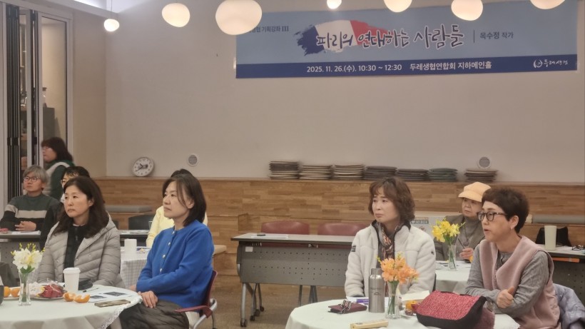 2025년 11월 26일, 두레생협연합회 지하 메인홀과 온라인(ZOOM)을 통해 기획강좌Ⅲ 「파리의 연대하는 사람들 – 프랑스의 연대와 협동조합 정신」이 진행되었습니다. 이번 강좌는 파리에 거주하며 현지 시민사회의 다양한 연대 현장을 기록해 온 목수정 작가를 초청하여, ‘연대(solidarité)’라는 가치가 일상 속에서 어떻게 실천되고 있는지를 살펴보는 시간으로 마련되었습니다.
