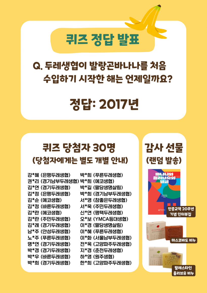[안내] 발랑곤바나나 정기구독 퀴즈 이벤트 당첨자 빌표 페이지 정보 작성자 두레지기 작성일25-12-15 17:37 조회1,611회 댓글0건 목록 본문 올해 처음 진행한 발랑곤바나나 정기구독! 총 12회차의 뉴스레터를 마무리하며, 그동안 함께해 주신 조합원 여러분께 감사의 마음을 전하고자 지난 11월 말. 12회차 뉴스레터를 통해 발랑곤바나나 퀴즈 이벤트를 진행했습니다. 참여해 주신 분들 가운데 무작위 추첨을 통해 16개 회원생협, 총 30명의 당첨자를 선정했습니다. 참여해 주신 모든 조합원 여러분께 진심으로 감사드립니다. ※ 문의 : 두레생협연합회 교육활동센터 배경선 매니저 (02-6710-5172, bgs@dure-coop.or.kr) 목록