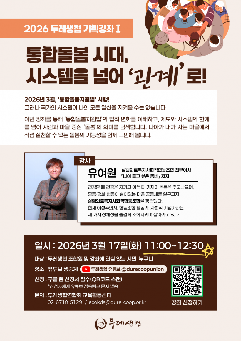 [모집] 2026 두레생협 기획강좌I : "통합돌봄 시대, 시스템을 넘어 ‘관계’로!“
