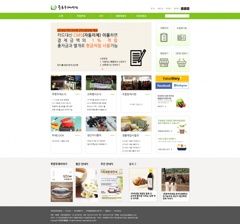 [푸른두레생협]홈페이지 리뉴얼 안내 페이지 정보 작성자 두레지기 작성일16-11-16 17:53 조회19,790회 댓글0건 목록 본문 푸른두레생협 홈페이지가 새로운 모습으로 조합원 여러분을 맞이합니다. 다양하고 유용한 소식을 전달하고 조합원이 소통하는 공간이 되기를 바랍니다. >> 푸른두레생협 홈페이지 목록