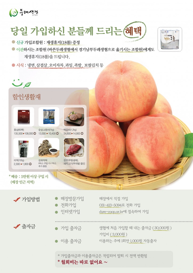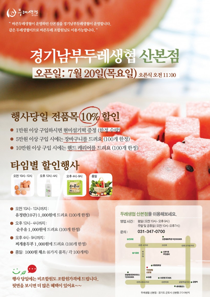[경기남부두레생협] 7월20일 산본점 새단장 오픈 페이지 정보 작성자 두레지기 작성일17-07-13 13:53 조회19,719회 댓글0건 목록 본문 초대합니다. 경기남부두레생협 산본점을 오픈합니다.바른두레생협에서 운영하였던 산본점을 같은 두레 연합회의 소속 생협인 경기남부두레생협이 조합원에 대한 상생과 연대의 마음으로 이어갑니다. 여러분을 초대합니다. 오셔서 많은 응원 부탁드립니다. ※ 가오픈 : 7월 14일(금) ※ 오픈행사 및 개소식 : 7월 20일(목), 오전 11시 ● 주소 : 경기도 군포시 산본동 213-9번지 103호 ● 전화번호 : 031) 347-0070 목록