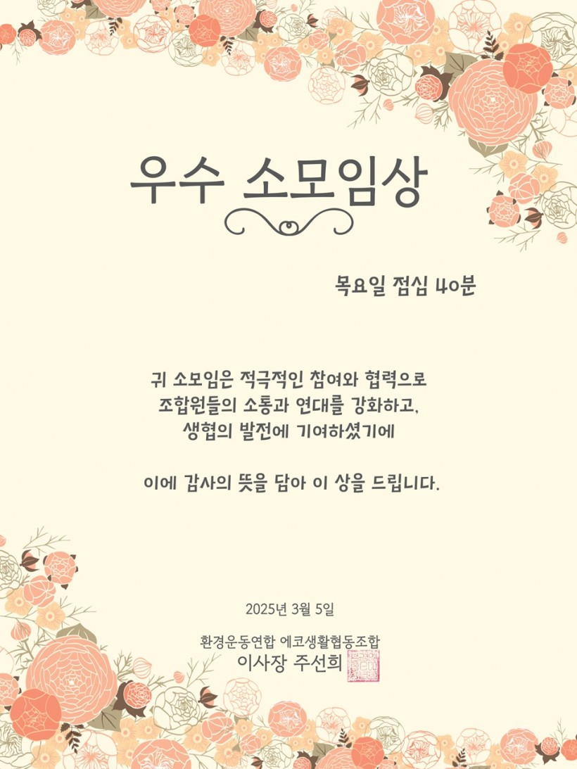그 중 에코생협 총회에서 우수 소모임상을 수상한