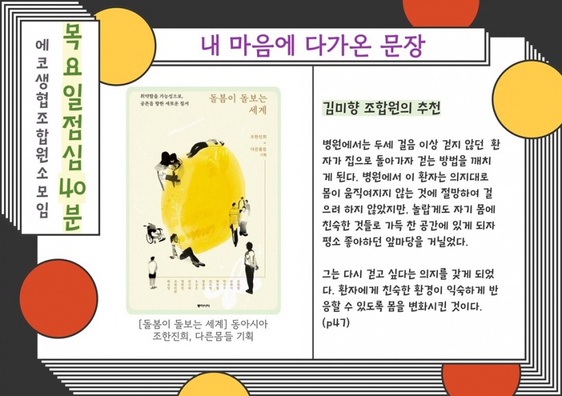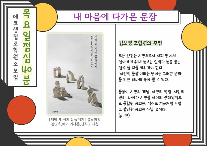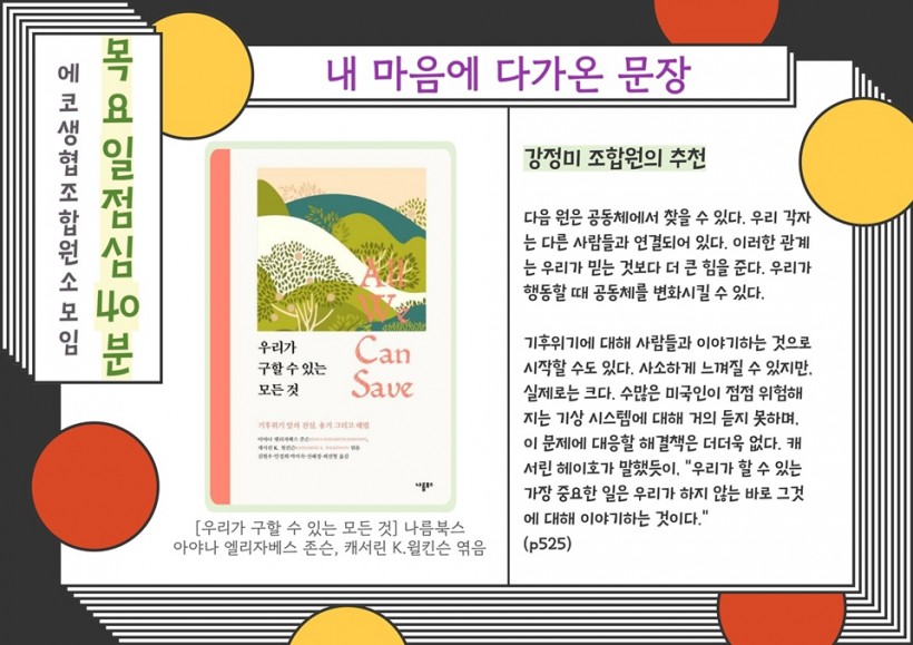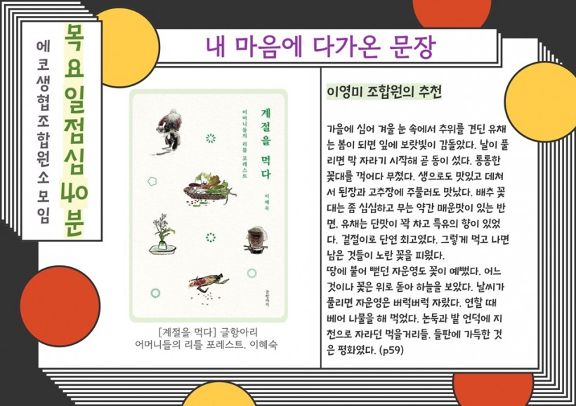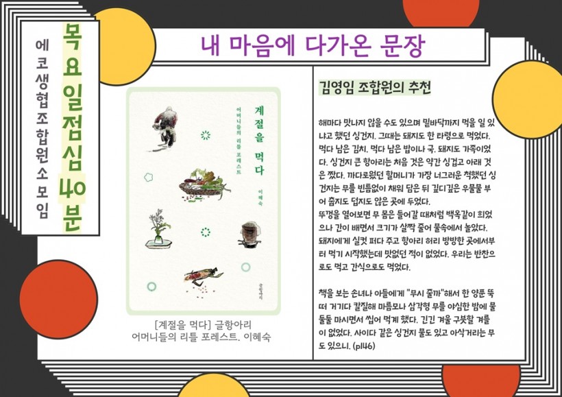 [에코생협] 목요일 점심 40분이 모여 책 다섯 권을 읽었어요!