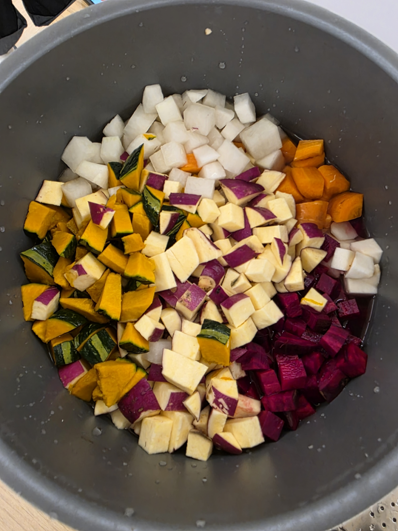오색뿌리밥은 토란, 당근, 비트, 고구마, 단호박, 감자, 콩 등