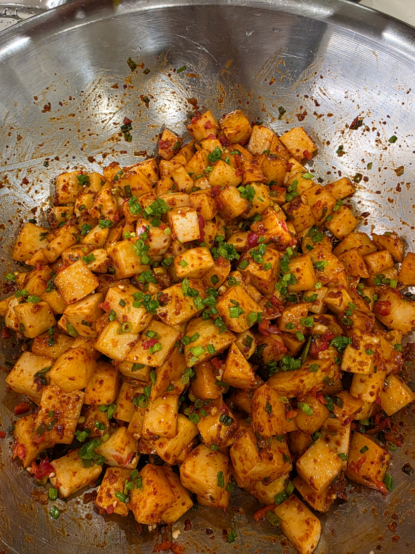 오늘 만드는 음식은 두부버섯전골, 오색뿌리밥. 무배깍두기, 뿌리전입니다.