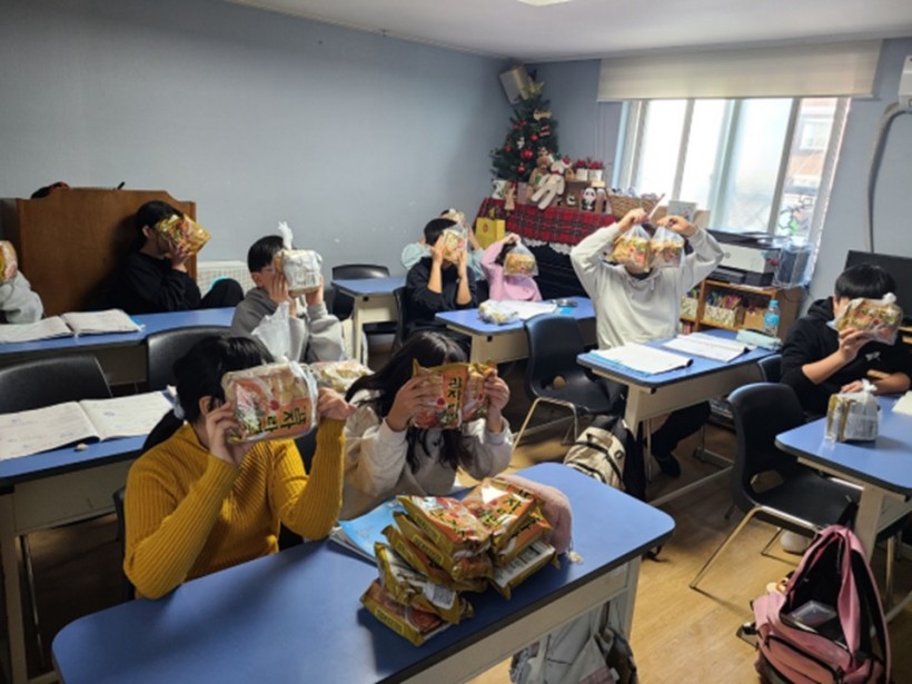 비타민 가득 사과와 보관기간이 긴 라면을 전달했습니다.
