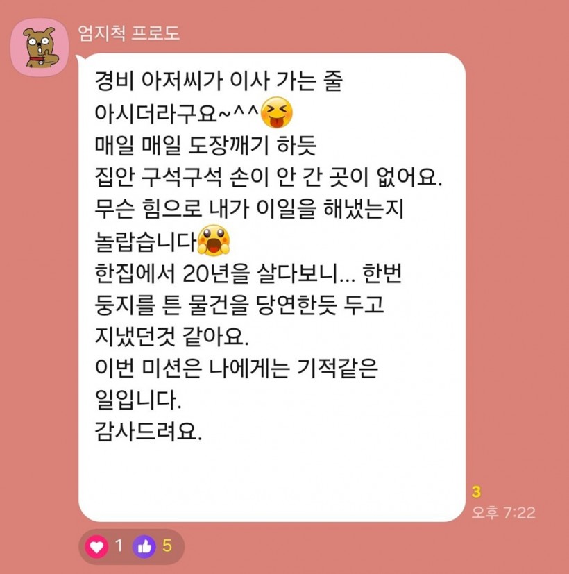 "경비 아저씨가 이사 가는 줄 하시더라구요~^^"