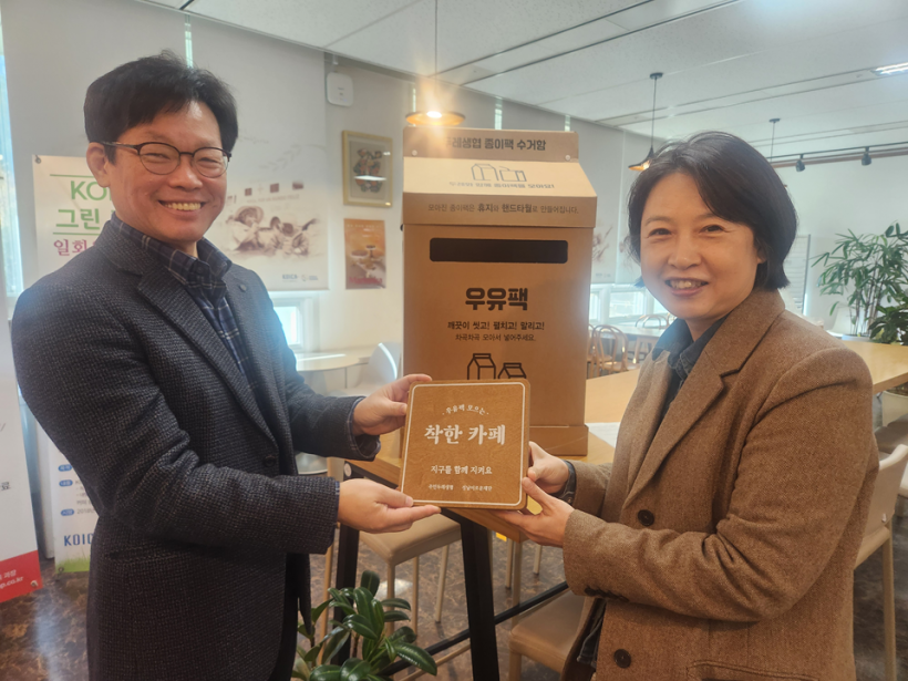 그리고 참여해 준 카페에는 <우유팩 모으는 착한 카페> 현판도 선물했어요.