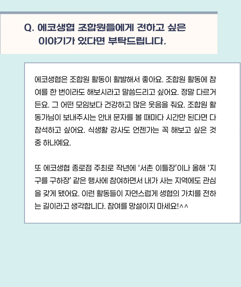 [에코생협] 소비를 넘어 삶을 함께하는 공동체 두레생협(최지설 조합원 인터뷰) > 회원생협 소식