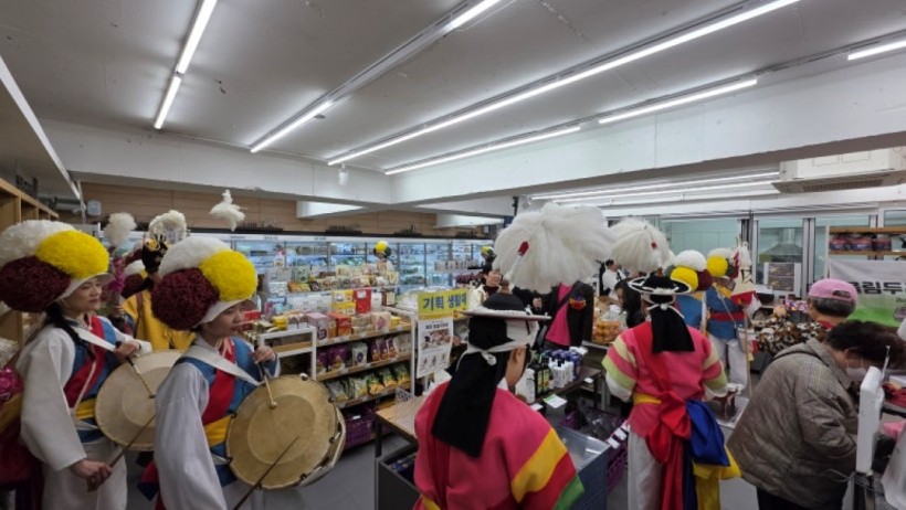 풍물패가 도착하자 매장 안은 금세 신명으로 가득 찼어요.