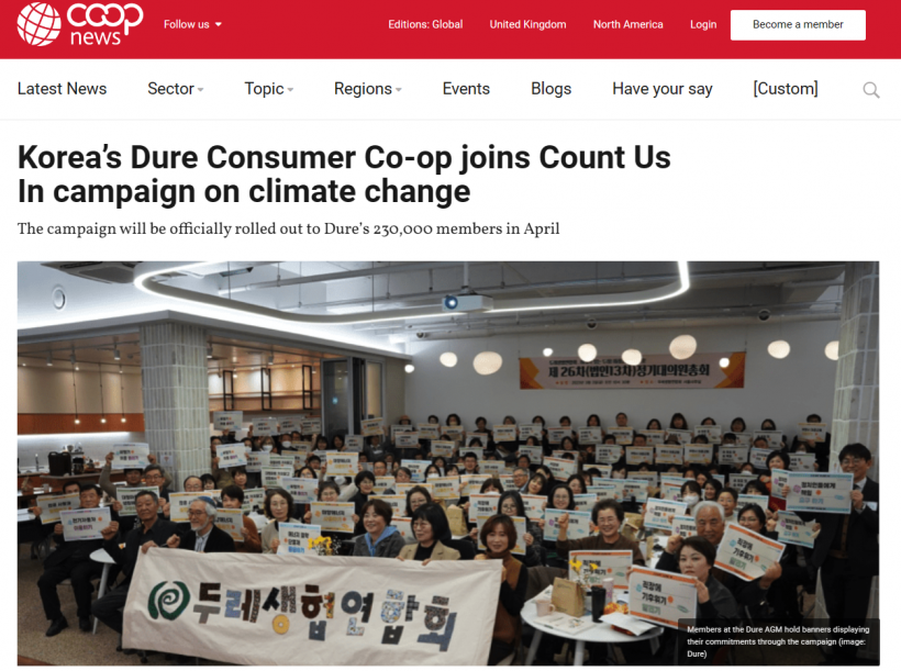 [세계협동조합] 4월소식 |전 세계협동조합 뉴스(Co-op News)에 소개된 두레생협 기후위기 대응 캠페인