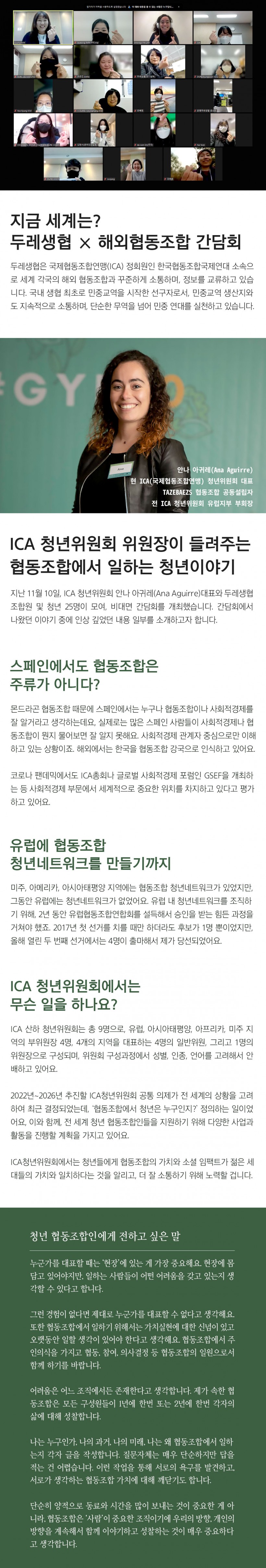 [기획기사] 지금 세계는? 두레생협ⅹ해외협동조합 간담회 (ICA 청년위원회 위원장) 페이지 정보 작성자 두레지기 작성일22-12-22 13:44 조회6,715회 댓글0건 목록 본문 목록