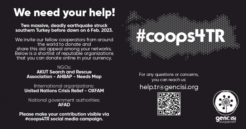 2015년 청년 및 소외계층의 고용, 생계 및 사회경제적 권리 접근을 개선하기 위해 설립된 튀르키예 이즈미르의 청년협동조합(Genc Ishi Cooperatif Youth Deal Cooperatif)을 포함하여 여러 터키 협동조합이 현재 피해자를 지원하기 위한 기금을 모으고 있습니다.