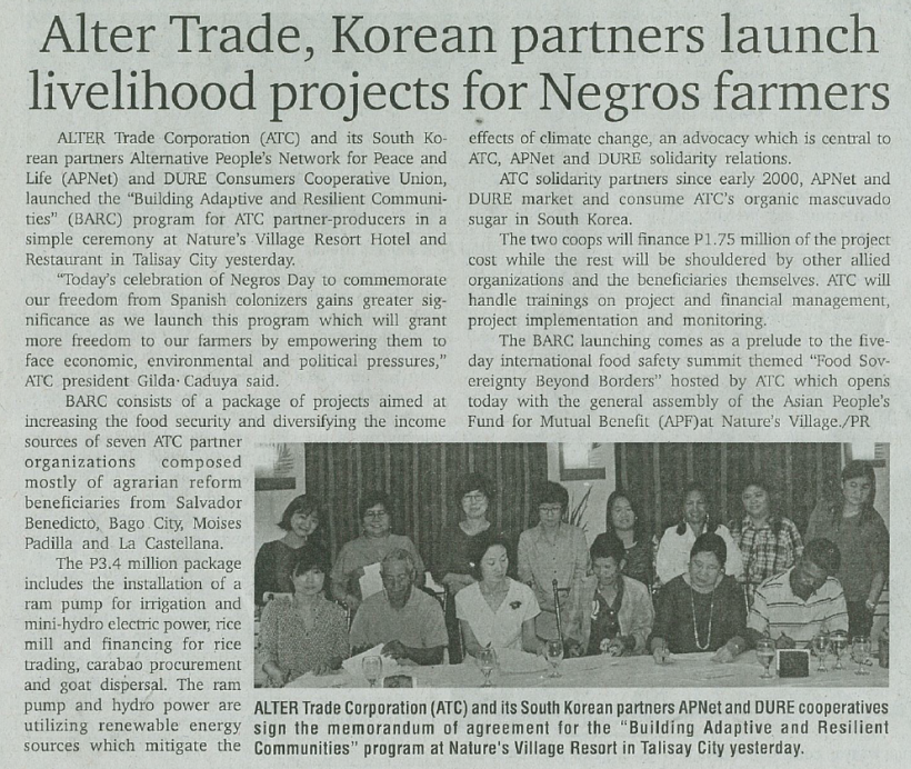 필리핀 네그로스의 Alter Trade Corporation (ATC)와 한국의 파트너인 두레생협 및 두레 에이피넷은 어제 네그로스 현지에서 생산지 개발 프로젝트인 네그로스 ‘바르크’ 프로젝트 (Building Adaptive and Resilient Communities, BARC) 협약을 체결하였다.
