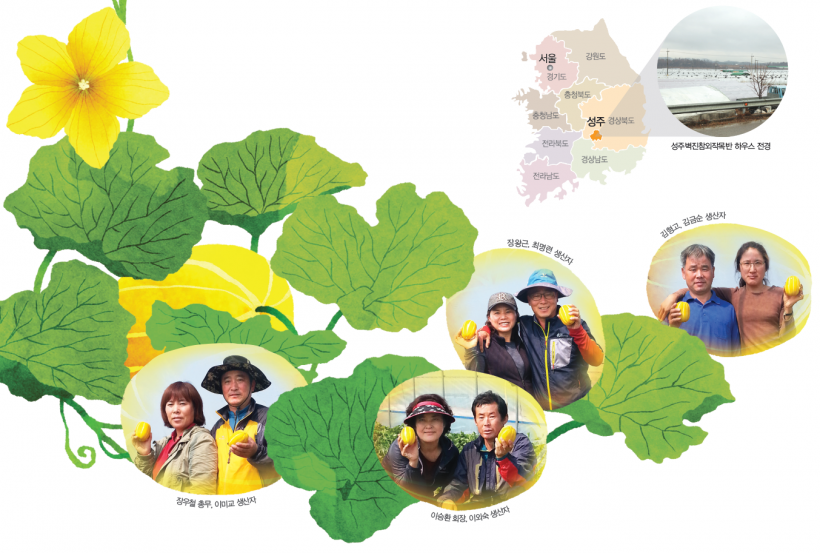 참외의 본고장이라는 성주에서도 친환경 참외를 재배하는 곳은 전체 3,500농가 중 단 26농가밖에 없습니다. 불과 0.7%밖에 되지 않는 친환경 참외 재배농가 중 하나인 성주벽진참외작목반은 4쌍의 부부로 이뤄져 있습니다. 고향 선후배사이인 남자 생산자들과 참외 농사에 문외한이었지만 경북 성주로 시집와서 참외 전문가가 다 된 여자 생산자들은 부부끼리 하루 종일 하우스에서 참외 농사를 지으며 함께 시간을 보냅니다.
