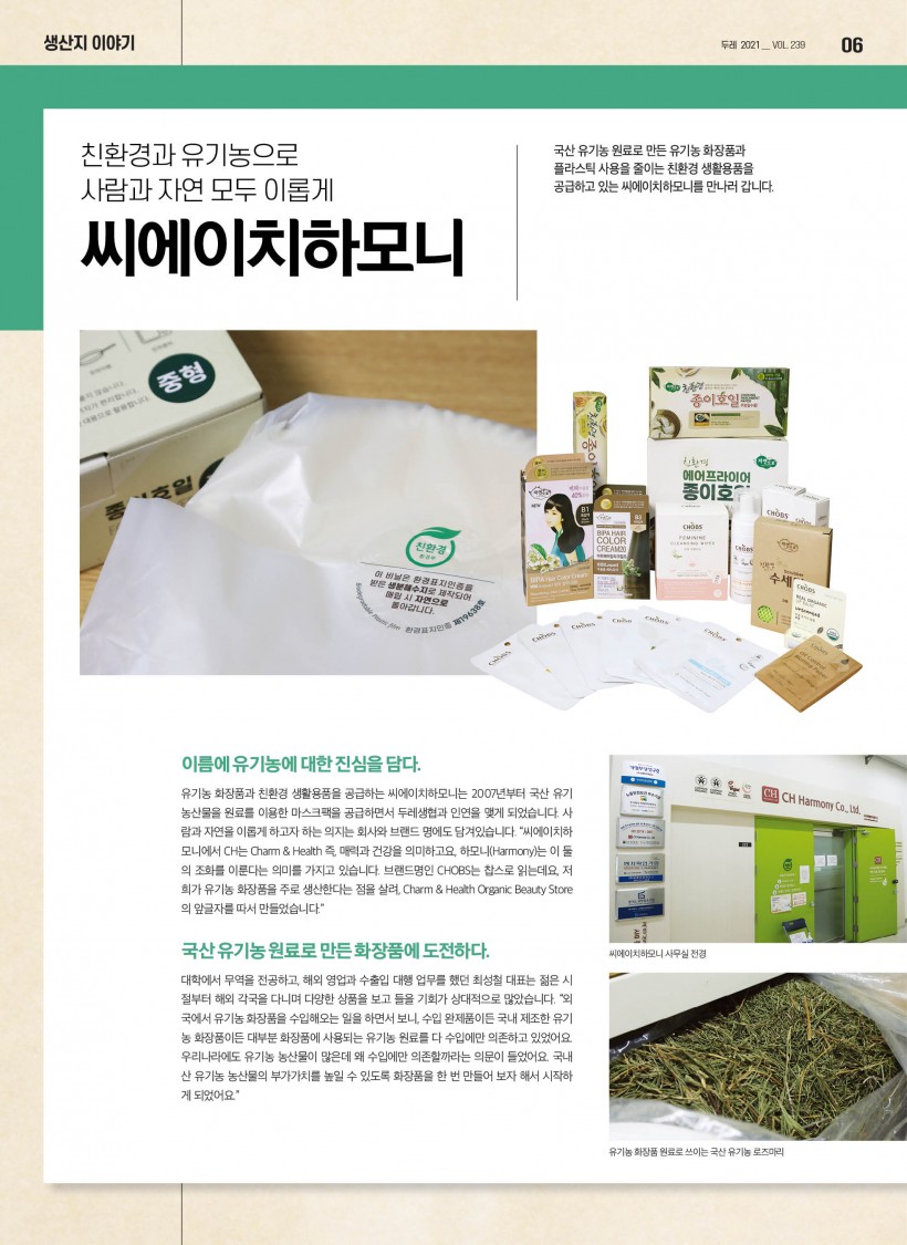 [씨에이치하모니] 친환경과 유기농으로 사람과 자연 모두 이롭게 > 생산지&생활재
