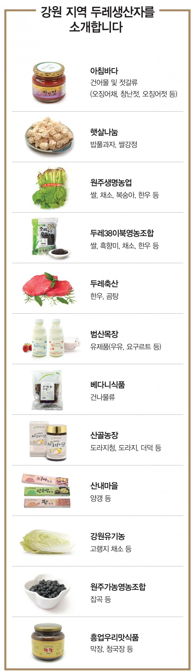 청정한 자연환경에서 정직하게 땀 흘려 농사짓는 강원 지역 생산자들이 공급하는 생활재는 오늘도 조합원 여러분의 식탁을 풍성하고 건강하게 채우고 있습니다.