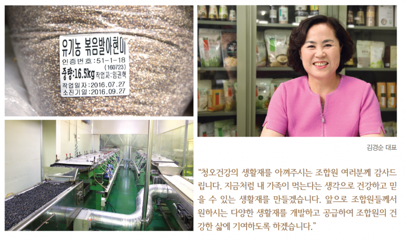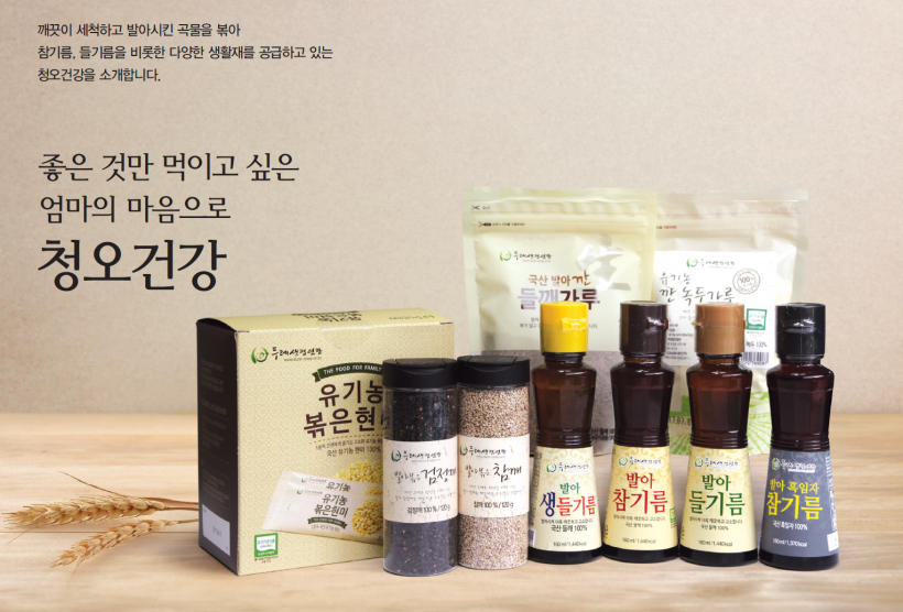 딸 하나, 아들 하나를 키우는 전업주부로 살던 김경순 대표. 조카가 야무지게 이유식을 만들어 아이들을 건강하게 키우는 것을 보고, 더 많은 아이들이 좋은 이유식을 먹고 컸으면 하는 바람에서 1993년 ‘엄마정성’이라는 이름으로 이유식을 만들기 시작했습니다. 개개인에게 맞춘 영양식을 제공하면서, 환자들을 위한 건강식도 만들게 되었습니다. 그렇게 쌓은 경험이 바탕이 되어, 2000년부터는 청오건강이라는 이름으로 곡물을 이용한 기름류, 선식류, 볶은 곡물 등 다양한 생활재를 개발,공급하고 있습니다.