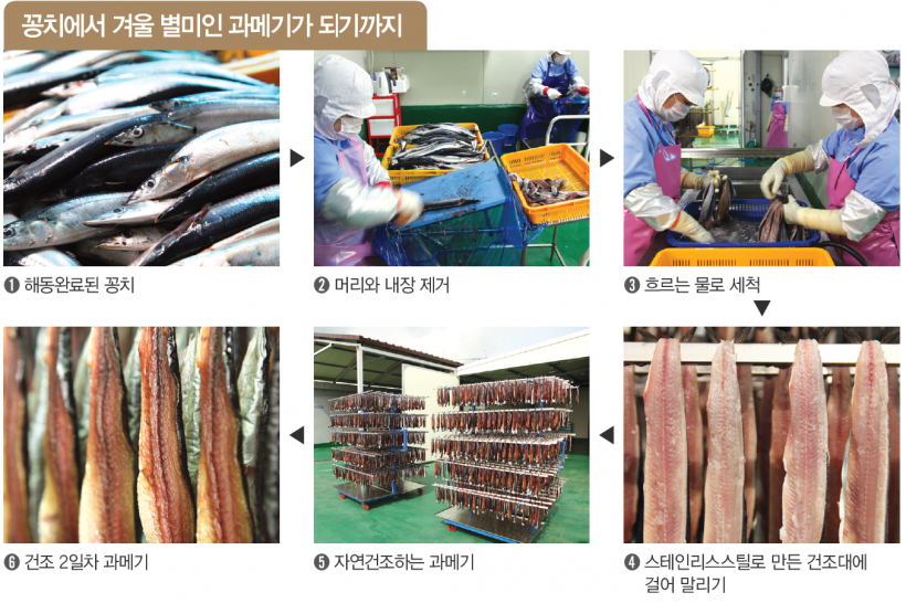 장천수 대표의 어머님은 식구들이 편하게 과메기를 먹을 수 있도록, 꽁치를 손질해서 반을 갈라 빨랫줄에 널어 과메기를 만들곤 했습니다. 건조하는 시간도 3일로 줄어들고, 비릿한 맛은 덜하고, 쫄깃한 식감이 더해져 먹기 편했습니다. 그것을 본 죽도시장의 한 상인이 자신에게도 손질하여 말린 과메기를 공급해달라고 요청했다고 합니다. 우연한 계기로 죽도시장에 공급되기 시작한 과메기가 불티나게 팔리기 시작하면서, 꽁치를 손질하여 말리는 방식이 대세가 되어 지금까지 이어지고 있다고 합니다.