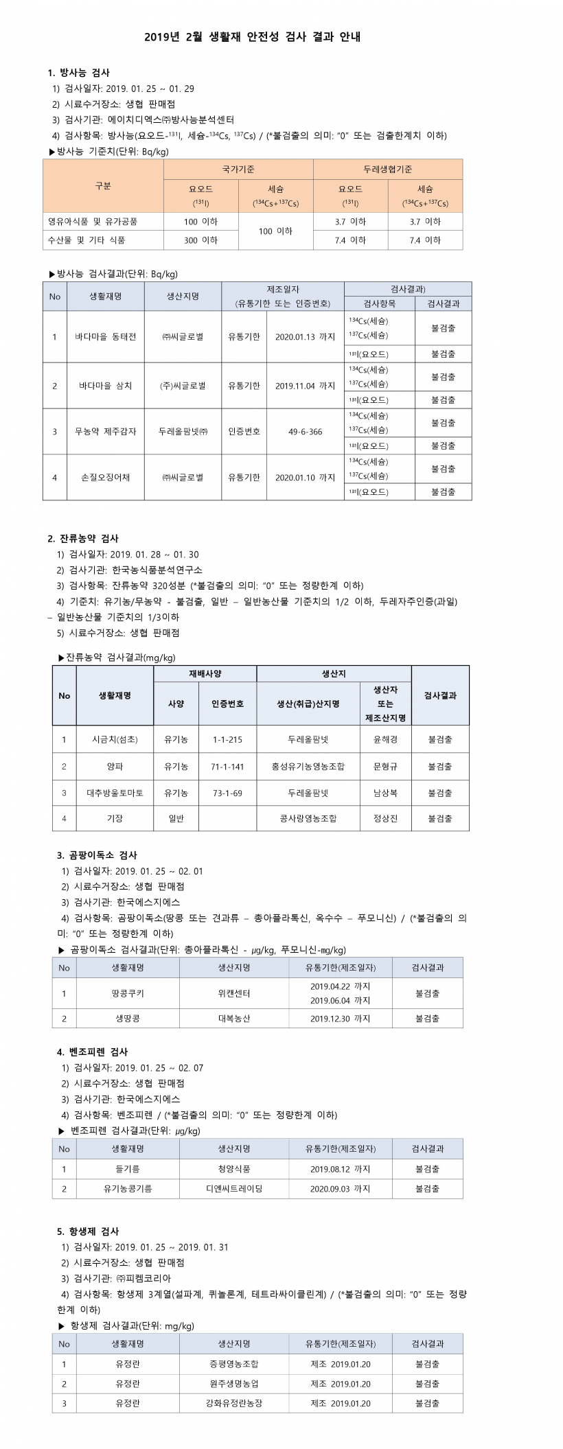 2019년 2월 생활재 안전검사 결과 > 생활재 검사결과