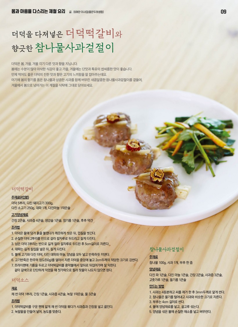 [제철요리] 더덕을 다져 넣은 더덕떡갈비와 향긋한 참나물사과겉절이 > 두레 COOK