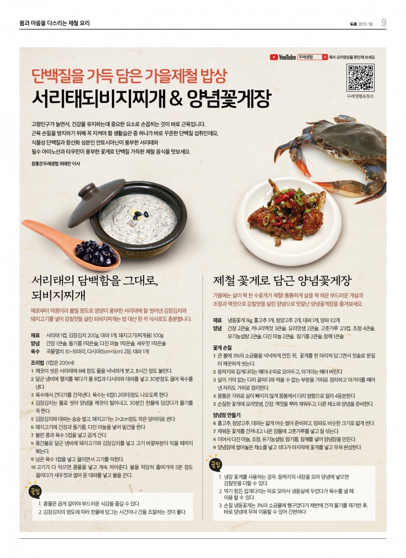 [제철요리] 단백질을 가득 담은 가을제철 밥상(서리태되비지찌개&양념꽃게장) > 두레 COOK