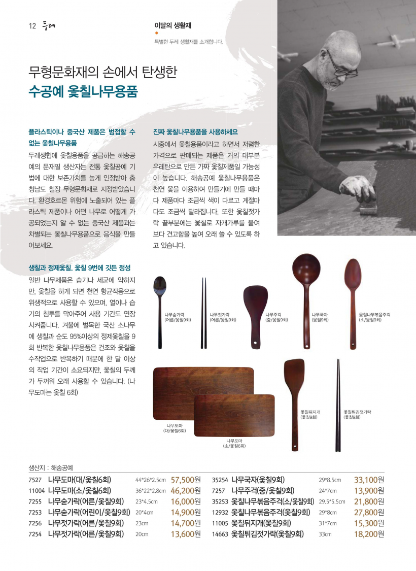 두레생협에 옻칠용품을 공급하는 해송공예의 문재필 생산자는 전통 옻칠공예 기법에 대한 보존가치를 높게 인정받아 충청남도 칠장 무형문화재로 지정받았습니다. 환경호르몬 위험에 노출되어 있는 플라스틱 제품이나 어떤 나무로 어떻게 가공되었는지 알 수 없는 중국산 제품과는 차별되는 옻칠나무용품으로 음식을 만들어보세요.