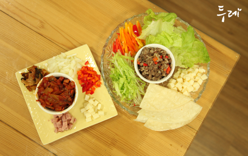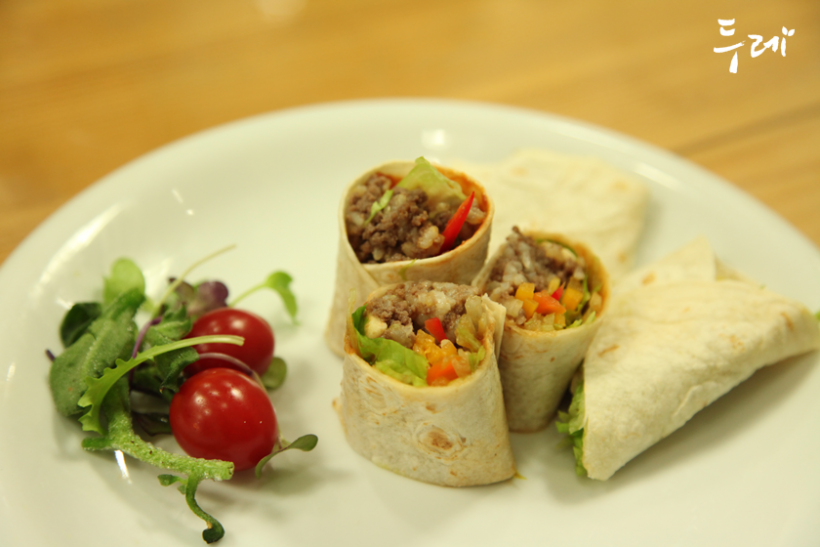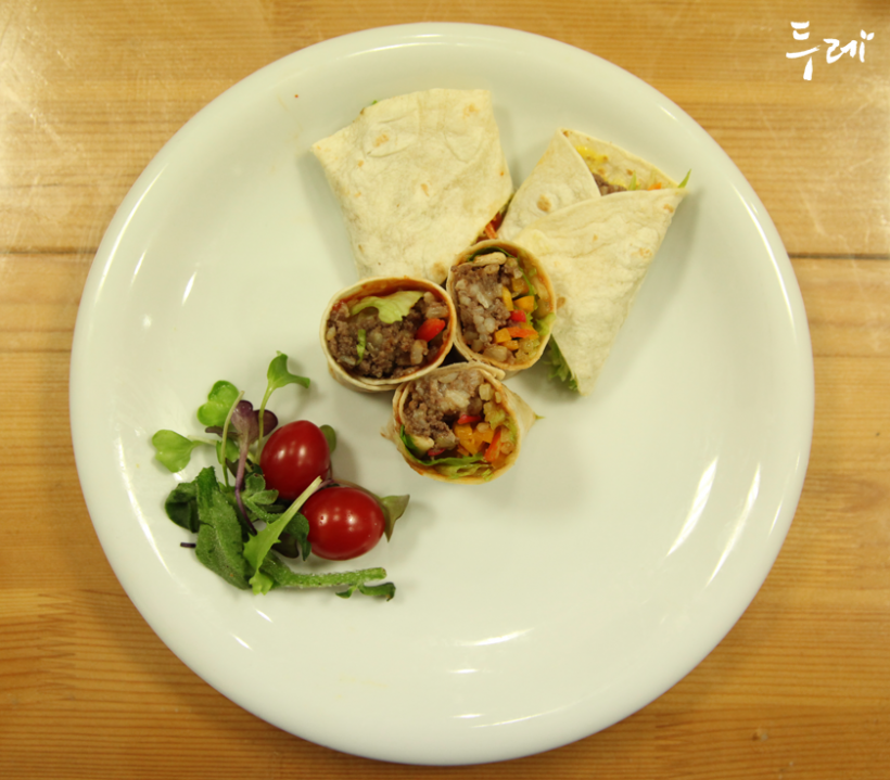 함께해요우리밀또띠아, 양상추, 유기농자연치즈(모짜렐라). 파프리카, 볶은김치(김치, 양파, 순살코기햄, 마스코바도) , 쇠고기볶음밥(다진쇠고기. 소금, 후추, 밥)