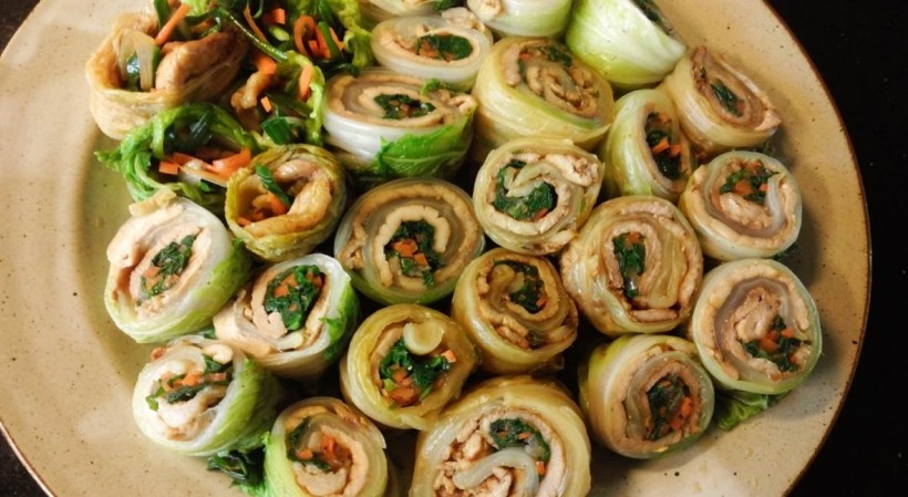 7. 데친 배추의 물기를 제거한 뒤, 배추 한 장에 고기와 채소를 올리고 김밥 말 듯이 돌돌 말아줍니다.